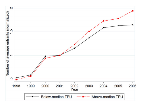 本项研究为不确定性环境下理解创业活动提供了新证据,研究结果表明目的市场中降低贸易政策不确定性有助于促进大型发展中国家的国内创业活动。通过利用中国加入世贸组织的“准自然实验”,发现贸易政策不确定性减少更多的制造行业其所增加的新公司更多。贸易政策不确定性减少所带来的效应在进入壁垒较低或不可逆投资较大的行业中更为显著。此外,政策不确定性的降低通过出口和非出口渠道促进新进入者,并有助于加强区域集聚力量。作者还发现,不同地区的出口成本和进入壁垒存在异质性,这说明对于发展中国家来说,外部开放和内部改革的重要协同作用。最后,研究证明贸易政策不确定性降低加剧了行业竞争,促使更优质的进入者进入市场,并且新公司的进入在将贸易政策不确定性降低与经济表现改善联系起来方面起着非常重要的作用。