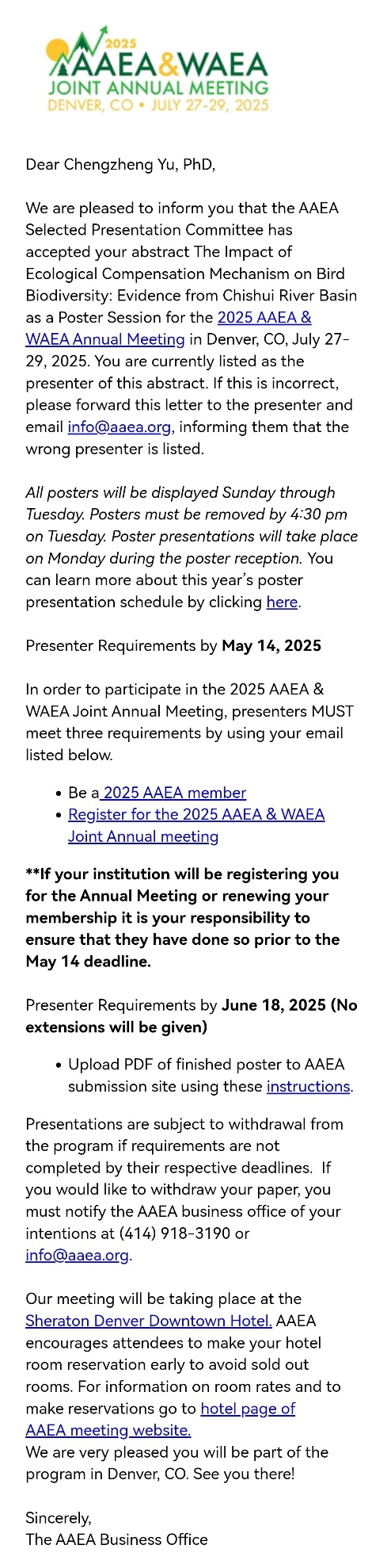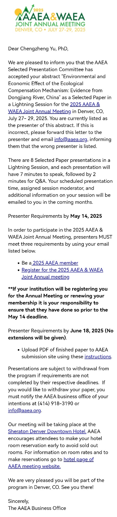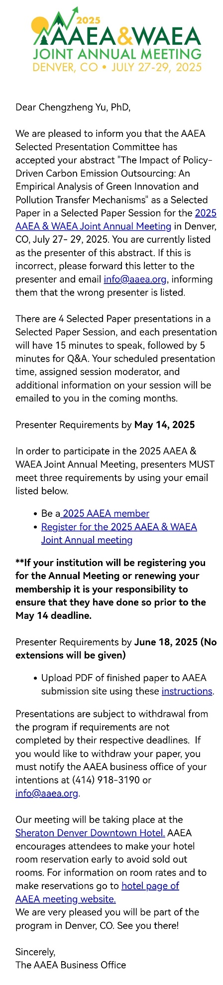 喜报 | 公司学子论文被美国农业与应用经济学学会2025年年会选中