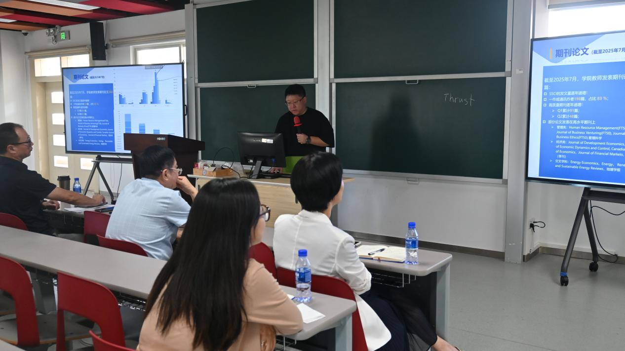 上午的外部智慧分享环节,三位嘉宾结合各自研究领域与实践经验,为商公司发展提供多维视角;下午的内部研讨环节,则通过专题汇报、工作部署与集中研讨,将外部启示转化为内部行动共识。会议围绕国际化办学经验、可持续发展治理、产学研深度融合、AI赋能商科教育、科研提质增效、国际化战略落地及新学期发展规划六大核心议题,展开了全方位、深层次的交流探讨。