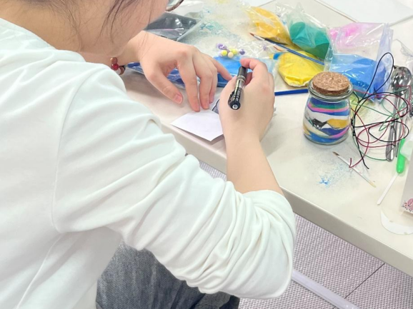 能量瓶DIY环节,同学们纷纷使用彩色沙、亮片、彩绳等进行手工制作。很快,一个个充满创意的 “情绪能量瓶” 便诞生了。这些独特的能量瓶承载着他们内心的情绪,也是同学们自我疗愈的寄托。
