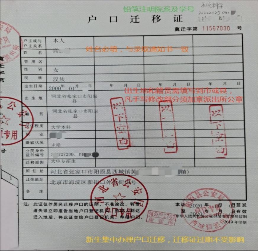 4. 《户口迁移证》过期不影响落户,但右下角须加盖派出所公章,否则无法落户。