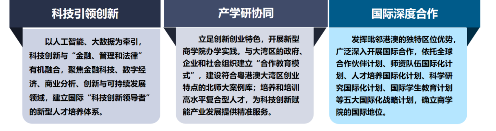 以人工智能、大数据为基础,融合科技创新与“金融、管理和法律”,聚焦金融科技、数字经济、商业分析、创新与可持续发展领域,打破单一学科的传统培养体系,建立国际“创新领导者”的新型人才培养体系。